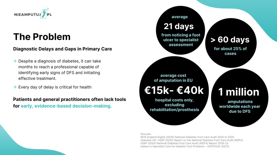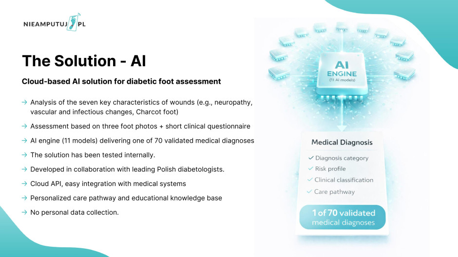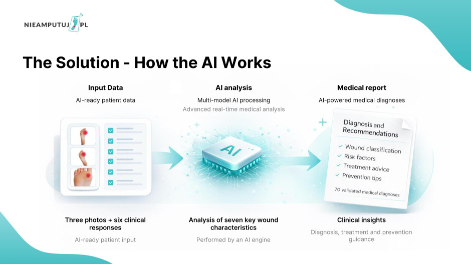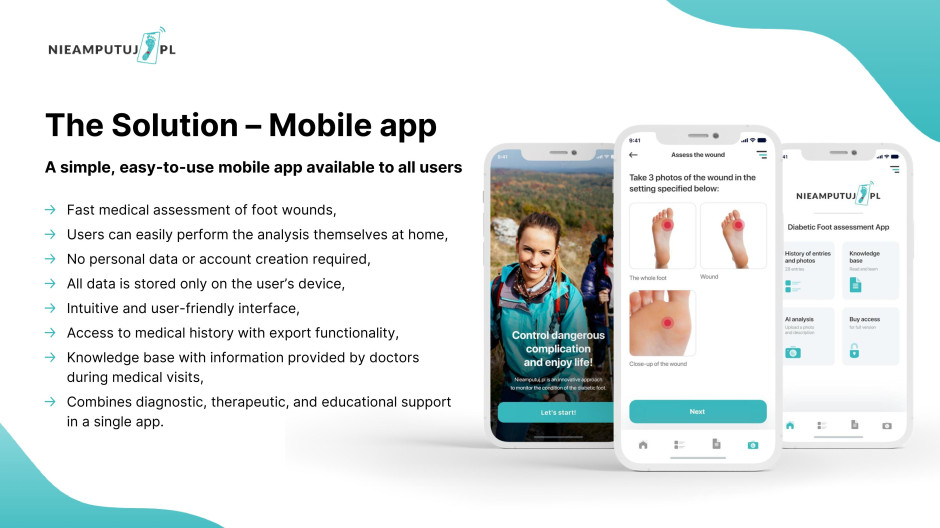 Nieamputuj to innowacyjny proces oceny ran występujących na stopach u osób z zespołem stopy cukrzycowej. Ocena przeprowadzana jest na podstawie trzech zdjęć rany (dwóch zdjęć rany z widoczną całą stopą oraz jednego zdjęcia przedstawiającego zbliżenie samej rany) oraz odpowiedzi na sześć pytań zadawanych pacjentowi.