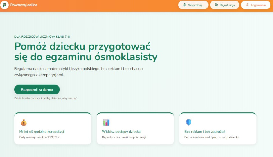 Powtarzaj.online to innowacyjna platforma edukacyjna wykorzystująca sztuczną inteligencję do interaktywnej nauki uczniów starszych klas szkoły podstawowej. Uczeń rozmawia z wirtualnym korepetytorem w formie czatu tekstowego — AI zadaje pytania, ocenia odpowiedzi zarówno pod względem merytorycznym, jak i językowym, a następnie naprowadza ucznia na poprawną odpowiedź zamiast od razu ją podawać.
