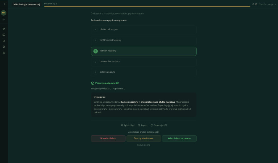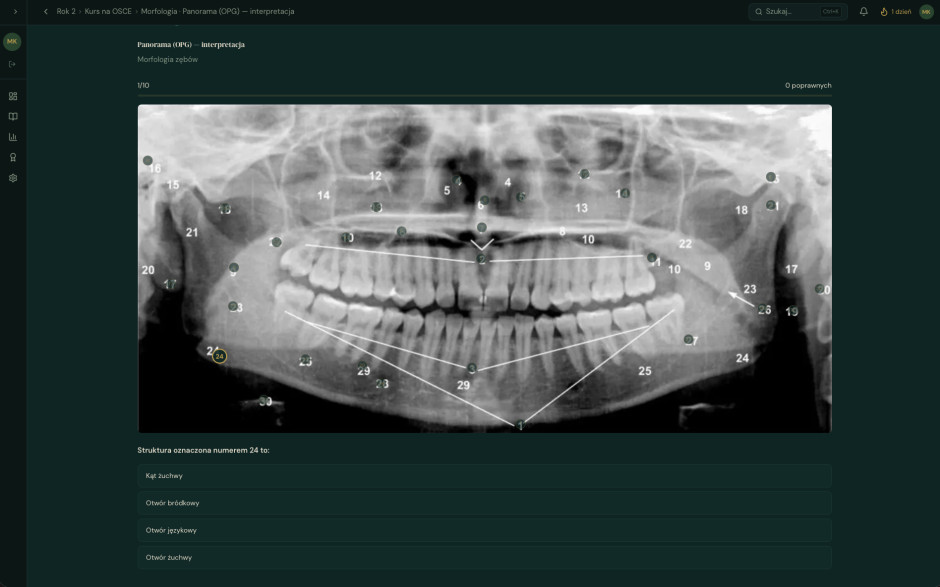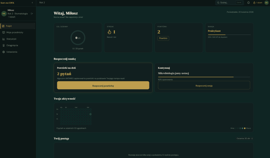 Nasz flagowy produkt, Kurs na LDEK, to pierwsza w Polsce w pełni adaptacyjna platforma do przygotowania do egzaminów dla młodych dentystów. Autorski silnik AI analizuje każdego użytkownika indywidualnie: słabe punkty, tempo uczenia się i harmonogram, budując spersonalizowaną ścieżkę do zdania egzaminu w czasie rzeczywistym.